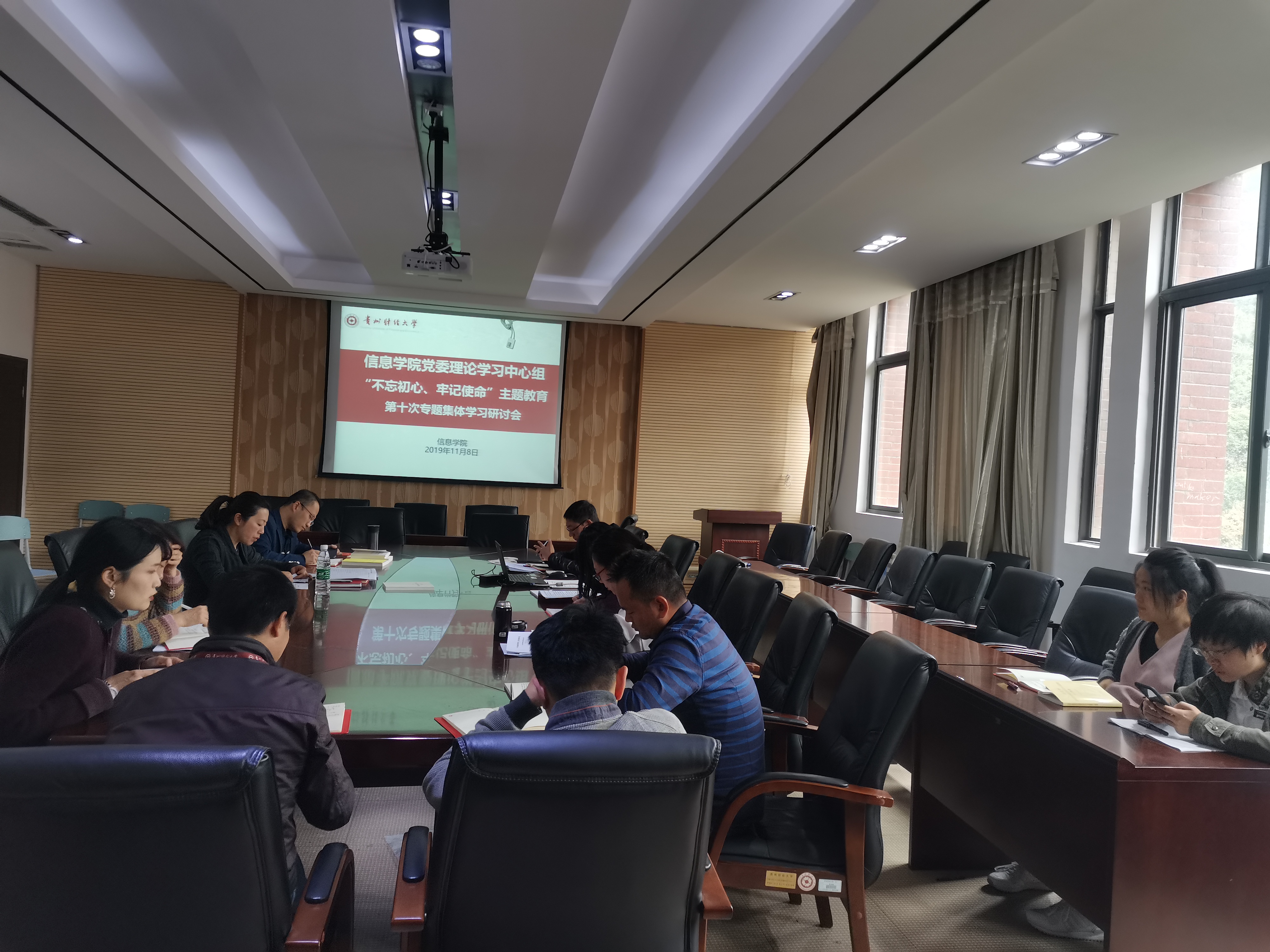 信息公司党委理论学习中心组于11月8日中午12点30分在志学楼427会议室理论学习中心组召开“不忘初心、牢记使命”主题教育第十次专题集体学习研讨会,公司领导、各系(科室)负责人、党支部书记参会,卿春主持会议。