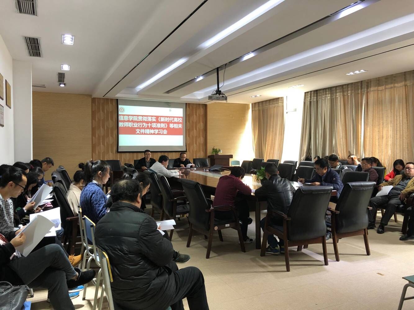 会上,郭长睿领学《新时代高校教师职业行为十项准则》、《教育部关于高校教师关于高校教师师德失范行为处理的指导意见》等文件精神。郭长睿强调,相关文件对教师的职业行为底线界定清晰具体,作为高校教师要自觉肩负起立德树人的神圣职责,肩负好培养社会主义合格建设者和接班人的重要责任,要把坚定正确的政治方向放在首位;要恪守师德、坚守底线、不越红线,珍惜教师声誉,自觉维护教师的职业尊严和光辉形象。
