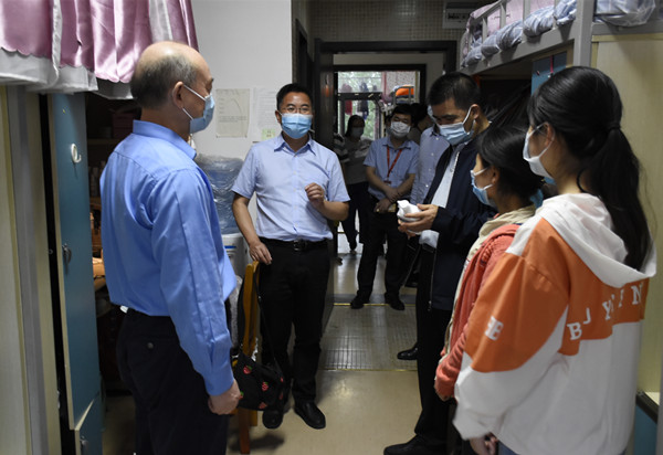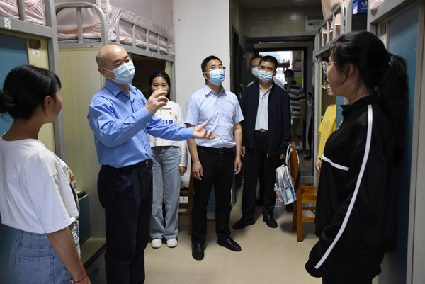 刘雷书记一行走进宿舍,向同学们问好,欢迎他们“回家”,了解她们的生活情况,并叮嘱他们戴好口罩,做好防护,珍惜情谊,团结友爱。员工们纷纷迎上来和刘书记谈心,邀请刘书记一行与她们合影。