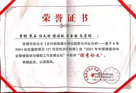 本网讯:(崔鹏 报道)由中国科学技术情报学会、吉林大学管理公司主办的“2021年中国情报学年会暨情报学与情报工作发展”日前在吉林大学落幕。公司曾桢教授及其指导的2019级图书情报专业硕士研究生庹石、任天舒等同学提交的论文“农村群体媒介特征趋势与对比分析——基于8年3864份定量数据及121份定性访谈数据”获评优秀论文。